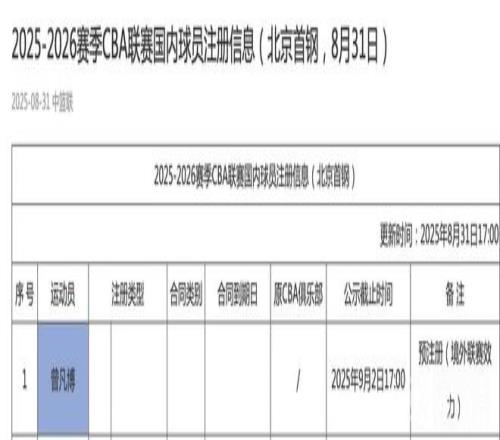 北京时间今日,CBA官网的注册信息显示,曾凡博已经在北京北汽的注册名单中。