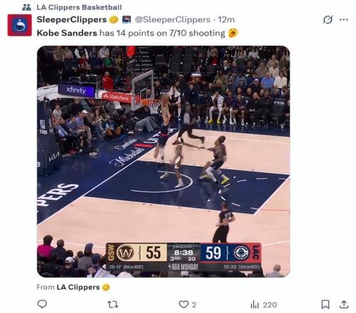 快船记者Lauren Rosen:桑德斯三节拿到20分已经创造生涯新高,微波炉球员。